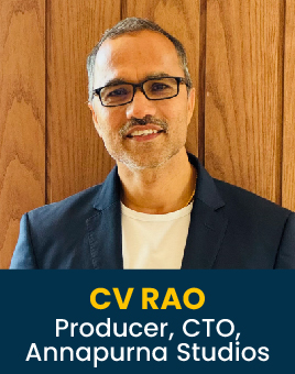 CV Rao (Producer & CTO, Annapurna Studios): Mr. CV Rao is the Chief Technology Officer at Annapurna Studios, a leading Indian film production studio. With a Post-Graduate degree in Economics and specialized training in film technologies, he began his career as a Graphic Designer before moving into post-production. C V played a key role in the success of iconic films like Baahubali and RRR, overseeing post- production for over 500 films. He is recognized for his visionary leadership, notably establishing one of India’s most advanced virtual production stages at Annapurna Studios.