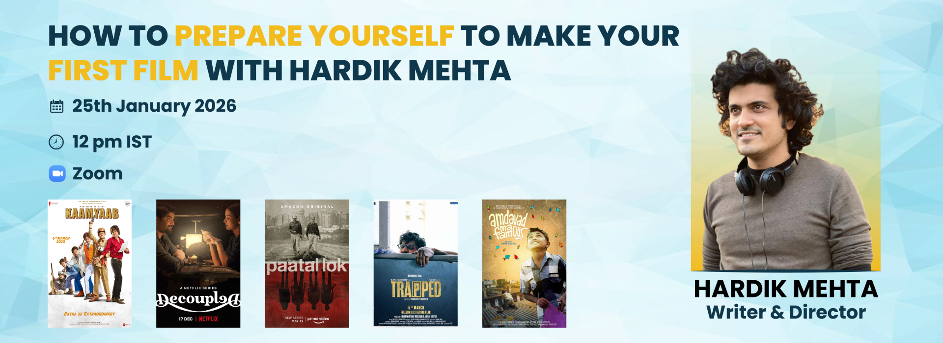 Join Hardik Mehta, National Award & Filmfare Award–winning writer-director, for an exclusive Cininfo Masterclass on storytelling, filmmaking, and building a first film that balances personal voice with market sense.
