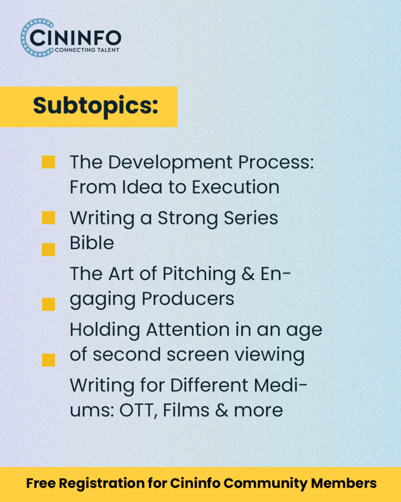 Join Cininfo Community for exclusive monthly sessions with a minimum of 2 up to 4 industry experts. Gain hands-on guidance, insider insights, and career-building connections tailored to early filmmakers and professionals. Your journey to a successful career in the entertainment industry starts now.