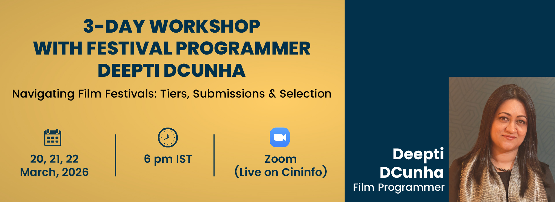 Join acclaimed festival programmer Deepti D’Cunha for an immersive 3-day workshop designed for screenwriters, filmmakers, and industry aspirants. Gain insider knowledge on festival ecosystems—from tiers and markets to crafting standout submissions and preparing for selection. Perfect for independent creators aiming to elevate their projects.Workshop Highlights: