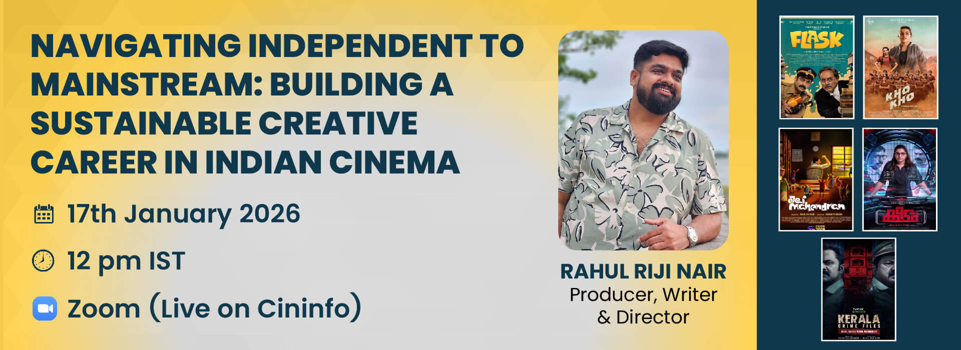 Join Rahul Riji Nair, National and State Award–winning filmmaker, screenwriter, and producer, for a focused Cininfo Masterclass on building a long-term creative career in Indian cinema.