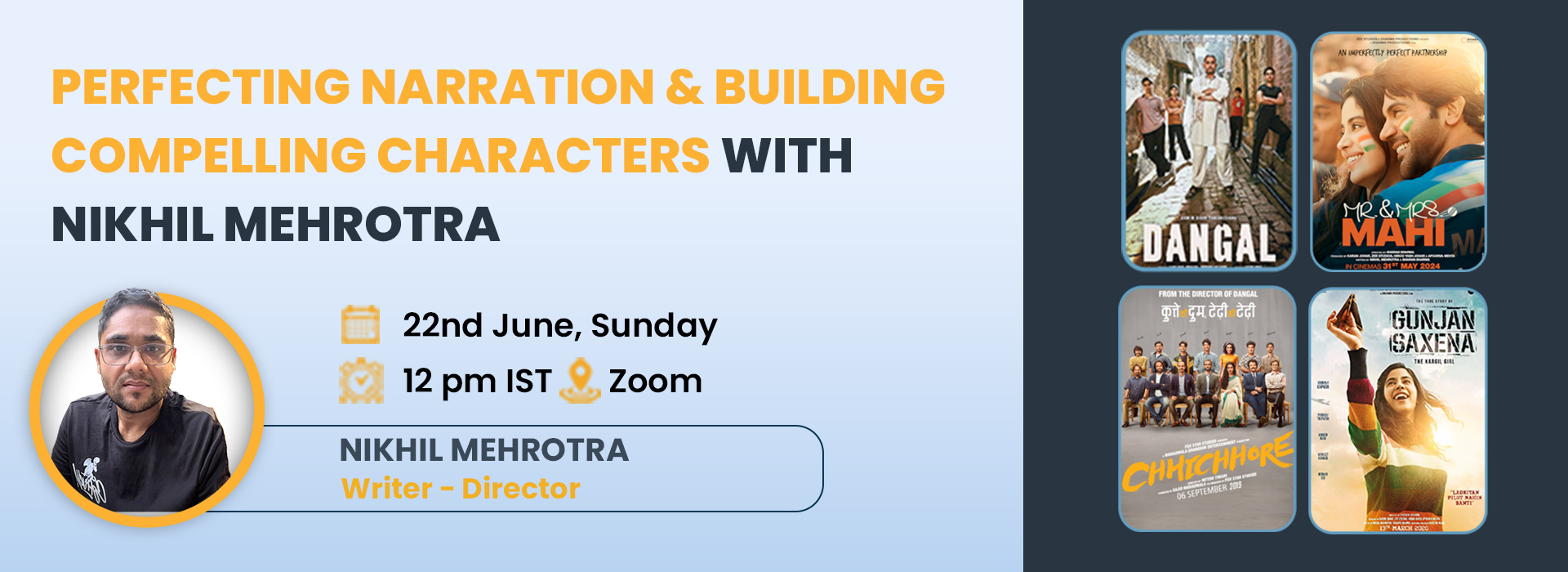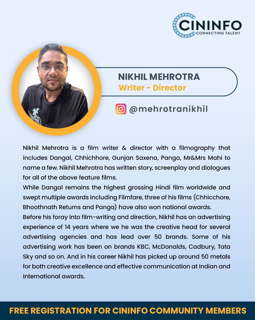 Join us for an in-depth session with acclaimed screenwriter and director Nikhil Mehrotra, the mind behind some of India’s most celebrated and emotionally powerful films. From scripting Dangal, the highest-grossing Hindi film worldwide, to crafting the soul of Chhichhore, Gunjan Saxena, Panga, and the recent Mr. & Mrs. Mahi, Nikhil’s work blends mass appeal with emotional depth and authenticity.