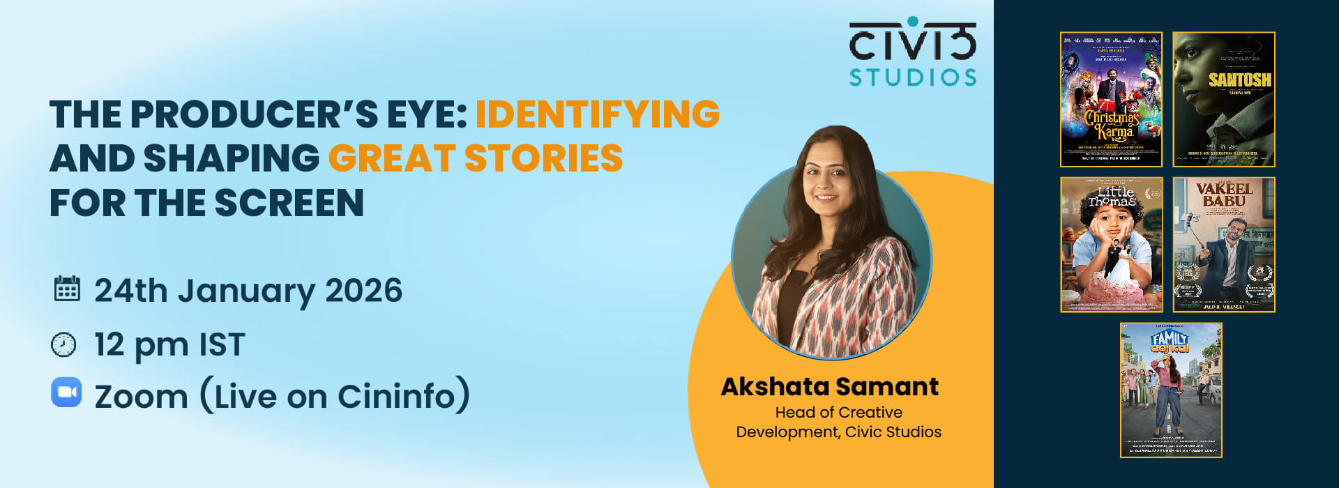 Join Akshata Samant, Head of Creative Development at Civic Studios, for a Cininfo webinar focused on how producers identify, shape, and scale strong stories for the screen.